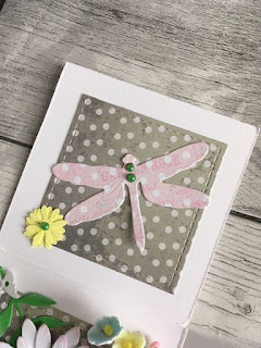Exploding card with a spring theme. Die cuts used were Dragonfly, daisy, butterflies , leafs and more . Some clay birds were used as well as a wooden ones. Cherry blossoms were tied together to form a branch and then coloured brown.